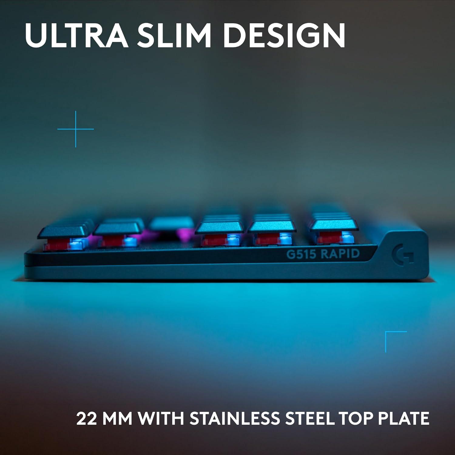 G515 RAPID TKL magnetic analog keyboard combines low-profile design and ultra-fast 0.1 – 2.5mm switches with high-performance analog technology for new breakthroughs in speed and responsiveness. Incredibly smooth and accurate, the advanced analog switches allow players to fully customize actuation points, rapid trigger settings, Key Priority setup, Multipoint Action, and more for a high-speed gaming experience. At only 22mm high, G515 RAPID TKL delivers exceptional ergonomic comfort, while the stainless steel top plate and multilayer construction offer unparalleled stability and a solid foundation for intense gaming sessions. LIGHTSYNC RGB and shine-through double-shot PBT keycaps give your gameplay style, and G HUB software puts deep control right at your fingertips.